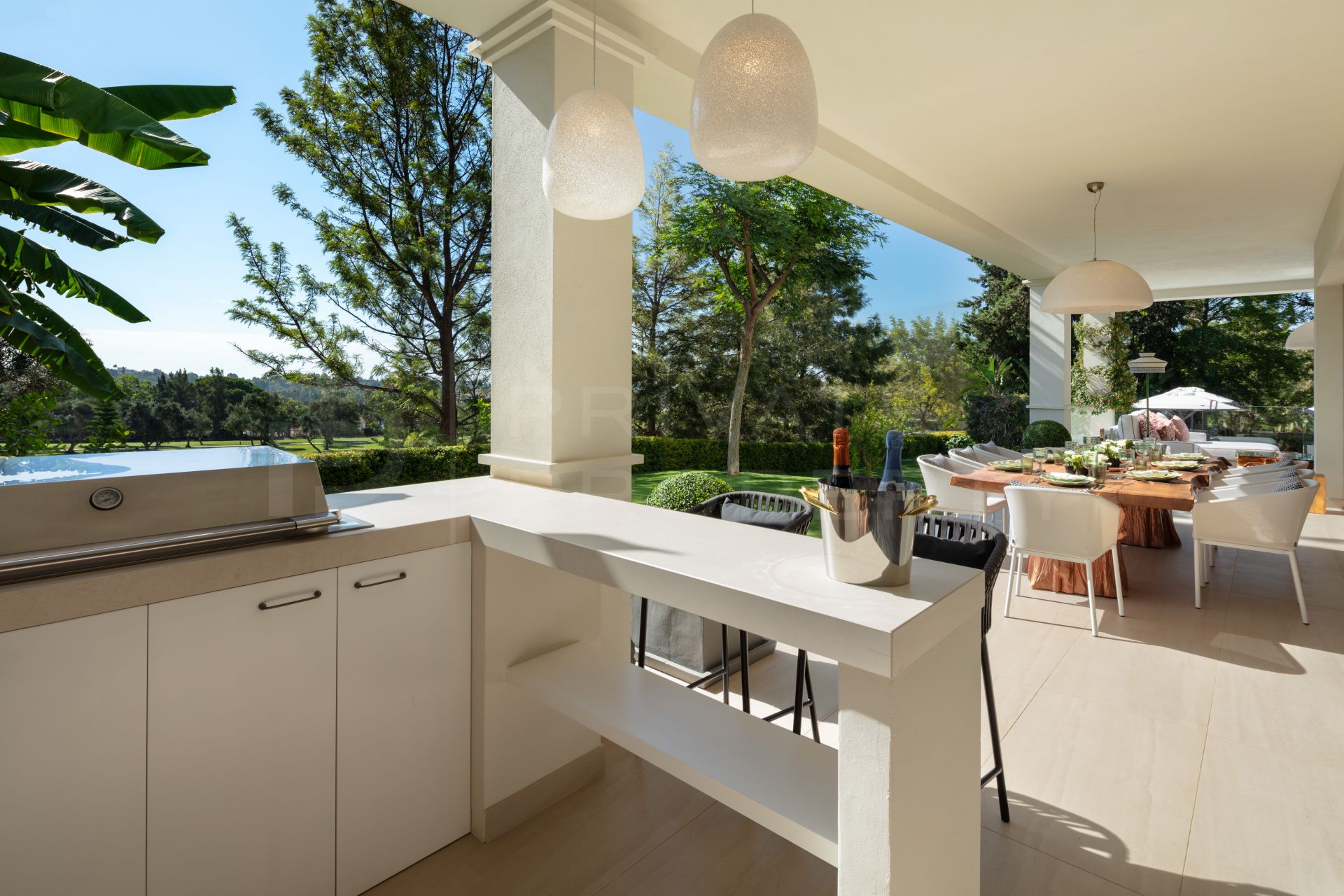 Outdoors, manicured gardens and oversized terraces wrap around the villa, offering private spaces for al-fresco dining, gatherings, or quiet moments overlooking the golf course. A striking private pool enhances the outdoor experience, while multiple shaded and sun-soaked areas invite year-round enjoyment of Marbella’s exceptional climate.