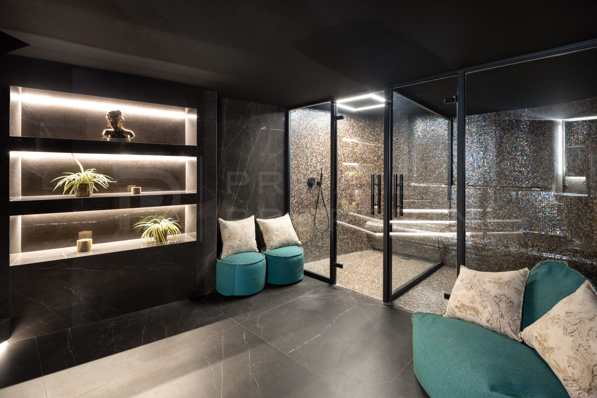 The villa’s lower level includes a private cinema room and a custom-built wine cellar, offering additional spaces for relaxation and entertainment. The outdoor area features a sculpted terrace leading to an infinity-edge saltwater pool, a jacuzzi, and a chill-out area with a firepit, landscaped garden perfect for enjoying the serene surroundings.