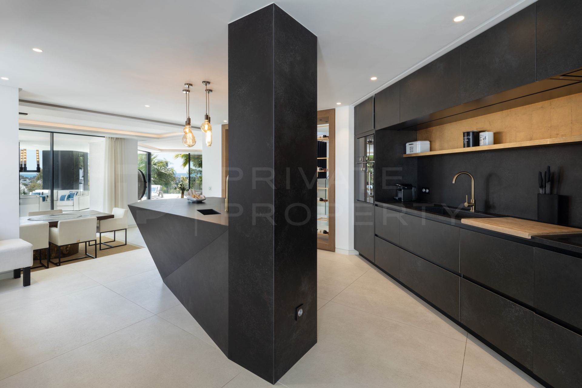 The open-plan living areas are designed to maximise natural light and provide seamless transitions between indoor and outdoor spaces, with large windows framing unobstructed views of the Mediterranean Sea The villa features five spacious bedrooms and six en suite bathrooms as well as two additional guest cloakrooms. Each room is adorned with bespoke furniture by Omeo Design, creating a cohesive and elegant aesthetic throughout the home.The kitchen is a standout feature, equipped with high-end Snaidero cabinetry, a brand associated with Ferrari designer Paolo Pininfarina, and designed in collaboration with Omeo Design. This space combines functionality with sleek, modern design, ideal for both everyday living and entertaining.
