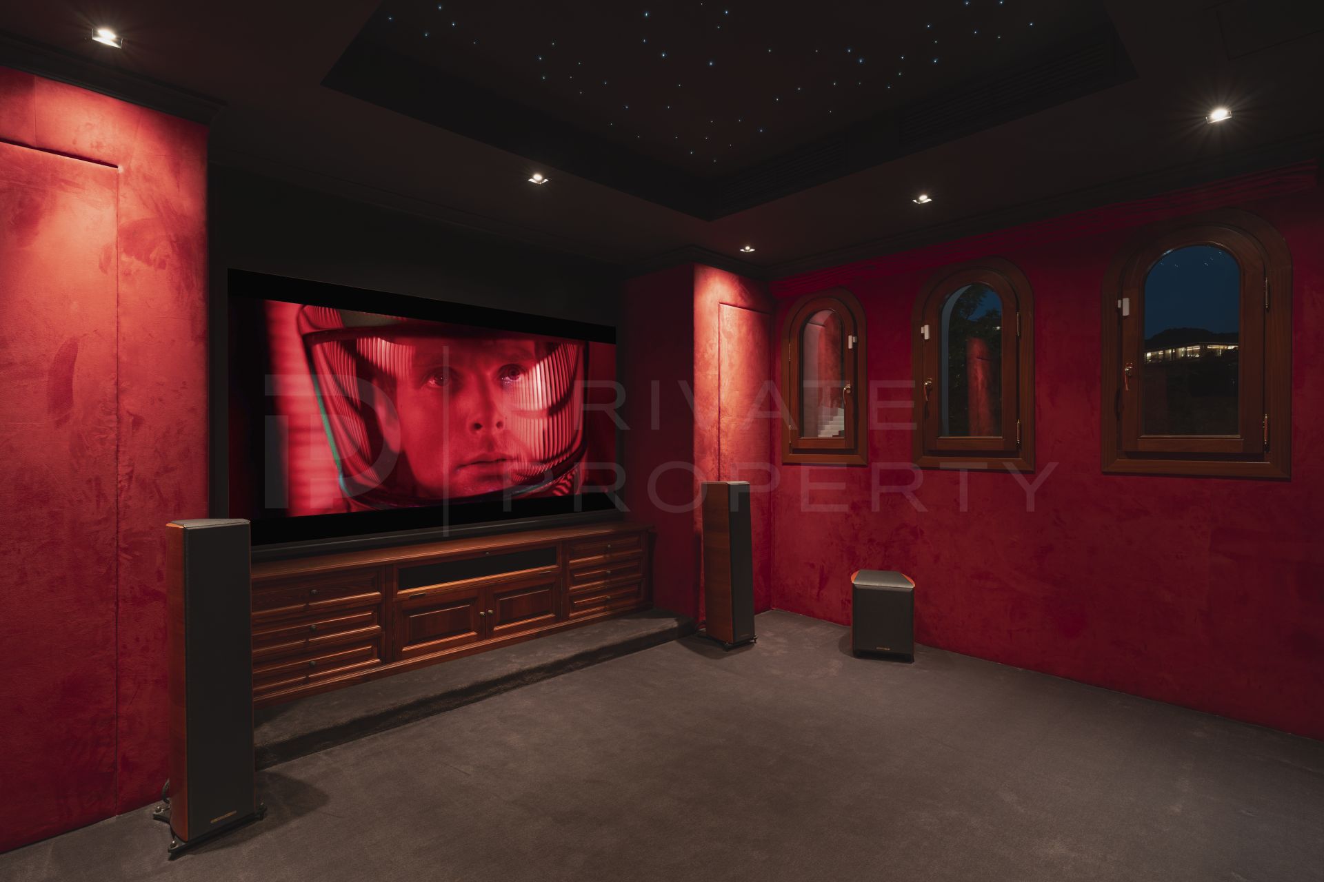 Inside, the villa features four bedrooms, each with its own en-suite bathroom. The interiors combine traditional architecture with spacious, open-plan living areas, warm materials, high ceilings, and graceful arches that create a timeless and welcoming ambiance. The home includes underfloor heating throughout, hot and cold air conditioning, a dedicated TV lounge, a home cinema room that can be converted into an additional bedroom, a walk-in closet in the master bedroom, an integrated surround sound system, and an automatic garden irrigation system.