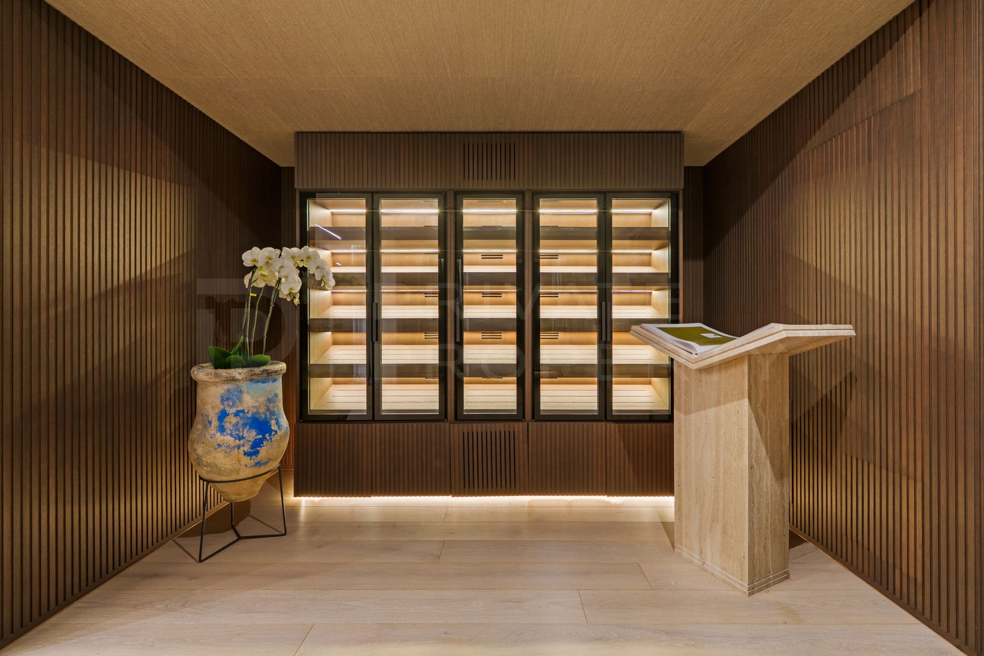 On the ground floor, formal and informal living areas unfold naturally around the garden and terraces. The layout allows for entertaining while remaining comfortable for everyday living – a balance rarely achieved at this scale. A dining room, fully equipped kitchen, wine cellar and guest suite complete this level, with large openings leading directly to the terrace and infinity pool, ensuring uninterrupted views and seamless indoor-outdoor living.