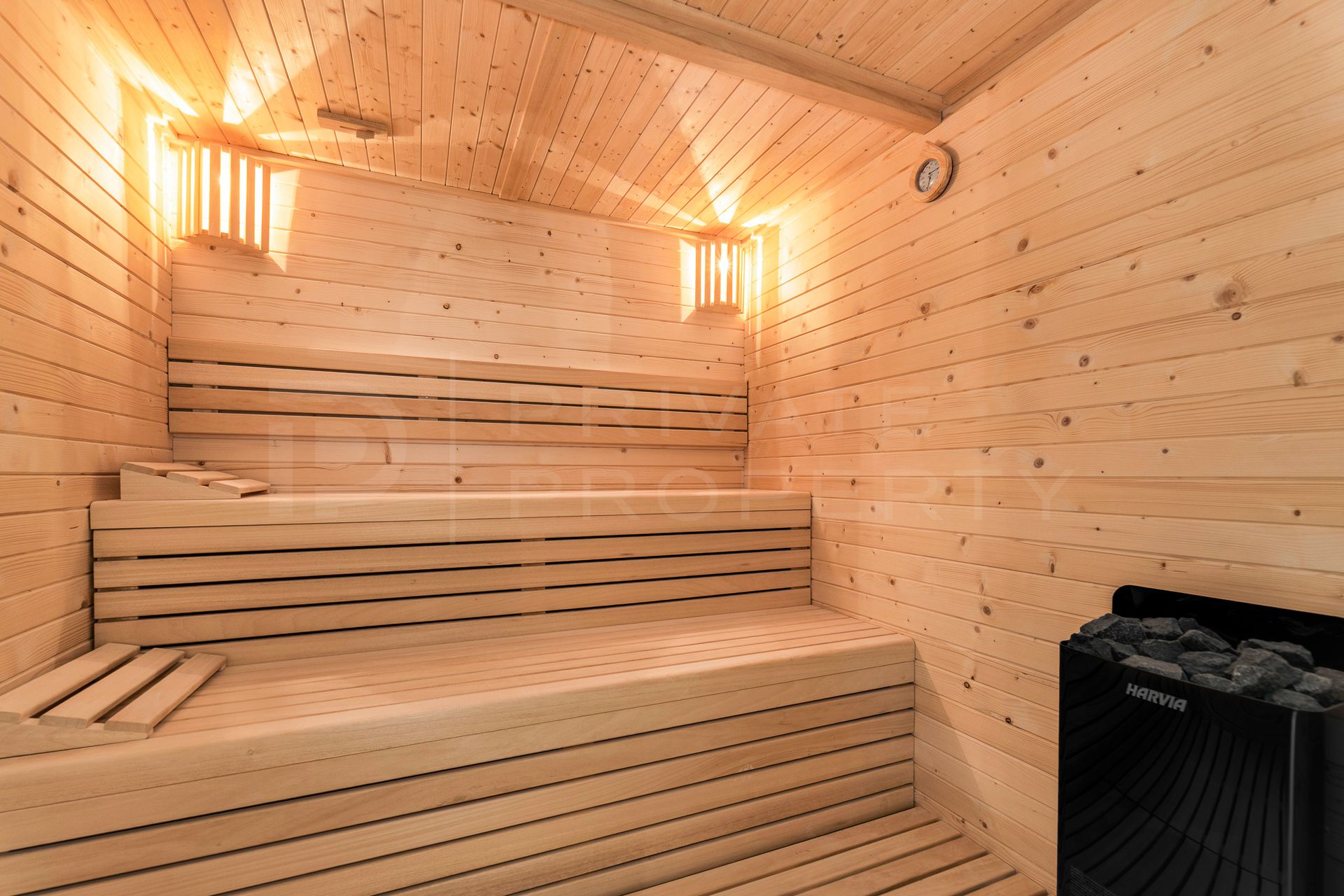 Spanning three levels, Villa Omega is the ultimate in luxury living. The lower floor is dedicated to wellness, featuring a private spa with cutting-edge micro-cementation technology, a heated indoor pool, Finnish sauna, and Turkish bath. The villa also boasts a fully equipped gym, a games room with a pool table, a bar, and an expansive wine cellar.