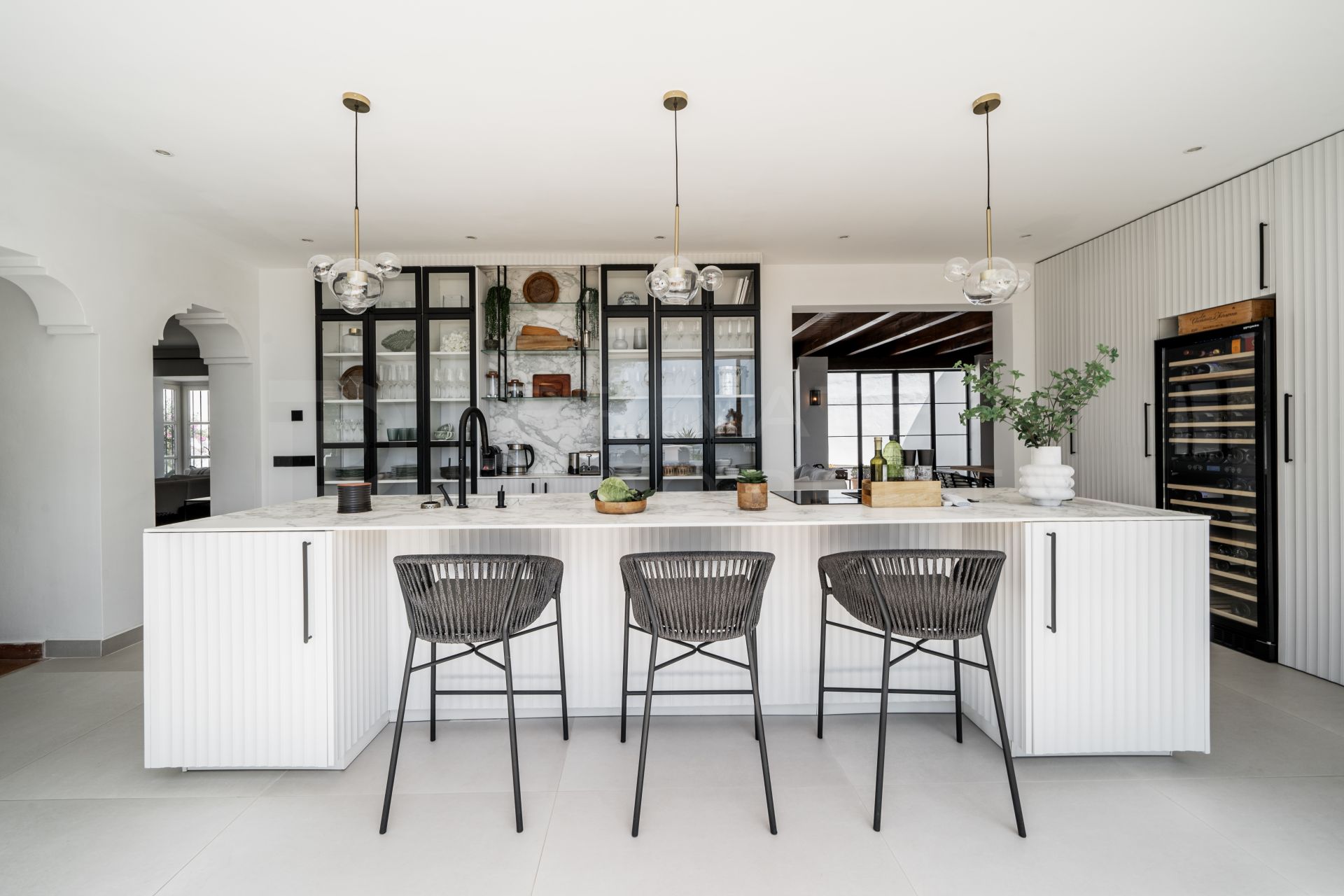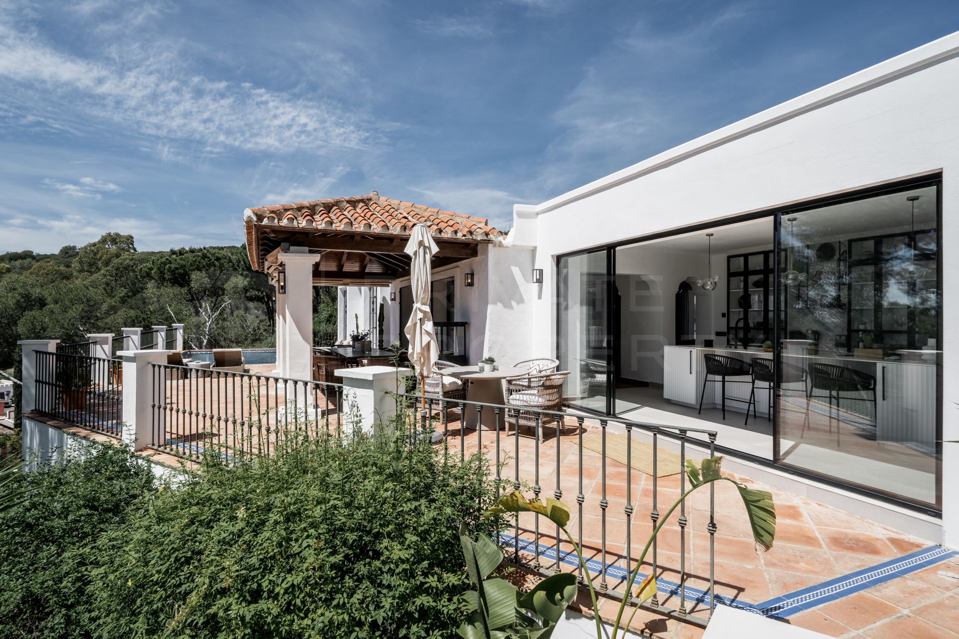 Arranged over a single floor of 255m², this stunning villa blends a cosy home atmosphere with expansive windows that seamlessly integrate indoor and outdoor living. Sold fully furnished, it offers elegant living and dining areas that flow into a fully fitted kitchen and also comprises four bedrooms, three en suite and an additional bathroom (all equipped with underfloor heating).