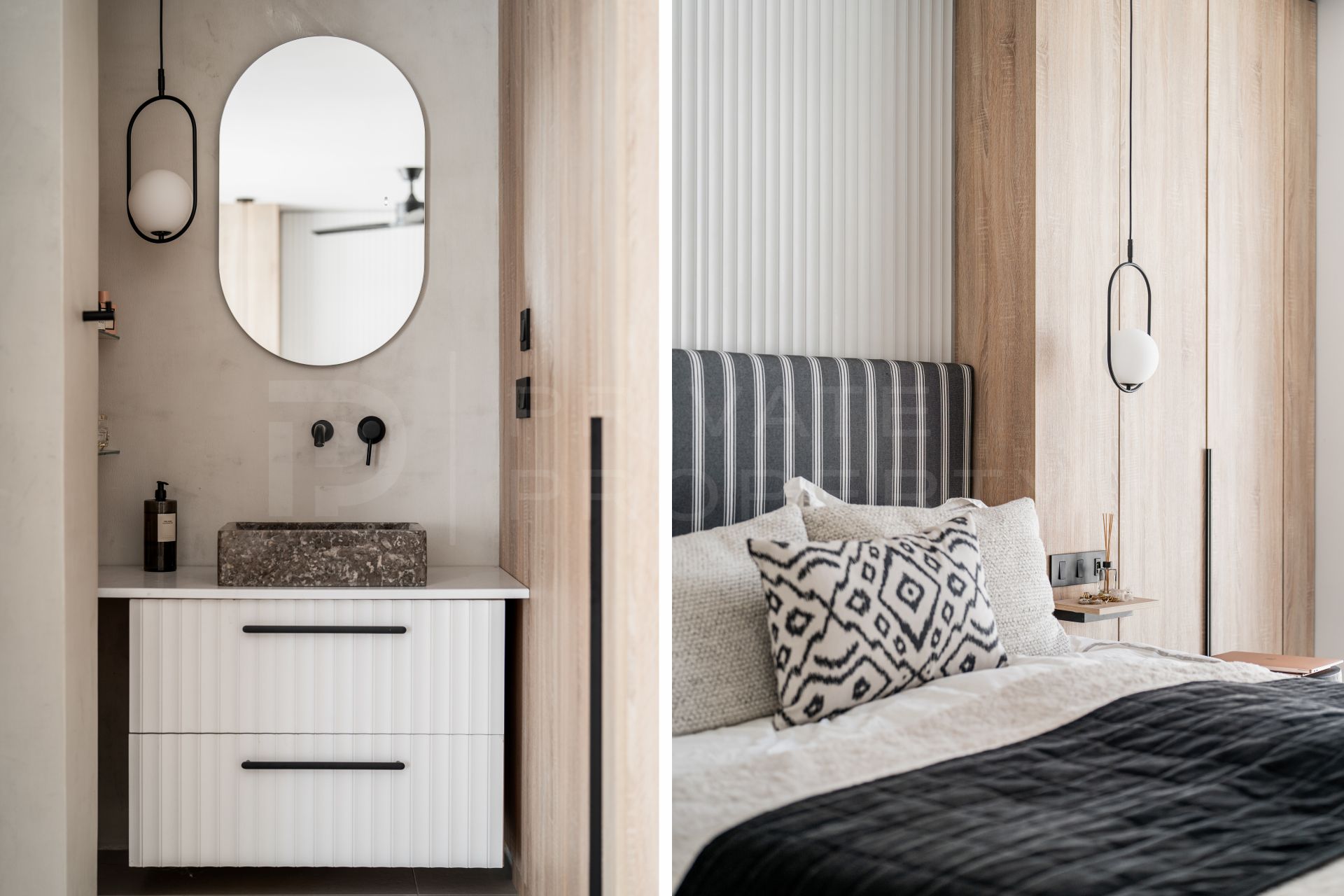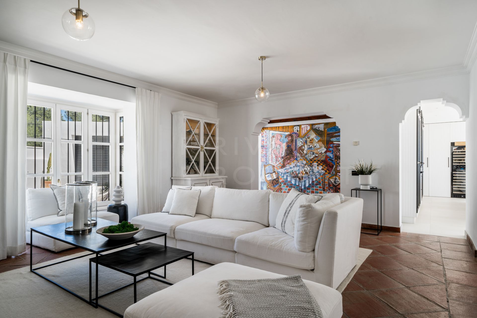 Carefully curated materials including white walls, terracotta floor, wooden accents and tasteful artwork which creates a warm and inviting atmosphere.