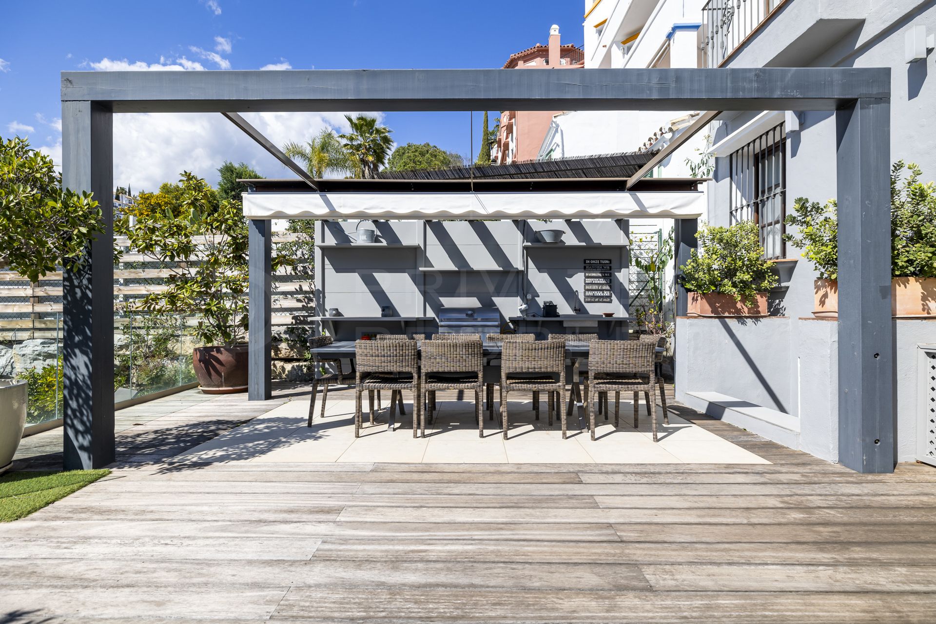 Main Floor: A staircase leads to the spacious living and dining area complete with a fireplace. The open-plan kitchen is fully fitted with high-quality Bosch and Liebherr appliances and gas cooker. This level also includes a guest toilet. From the living area, there is direct access to a covered and open terrace which extends to a comfortable lounge and barbecue area, along with the garden and private pool.