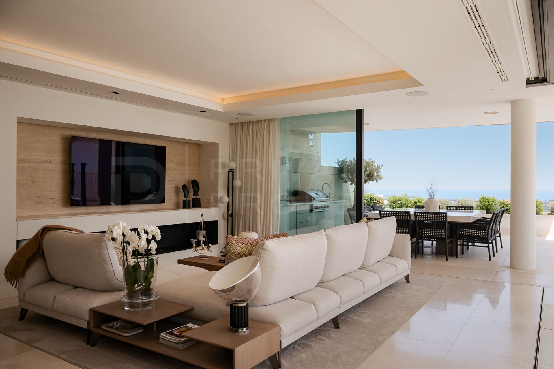 The interior features a spacious open-plan layout where the living and dining areas flow seamlessly into a contemporary designer kitchen fitted with top-of-the-range appliances. Floor-to-ceiling windows flood the space with natural light and open directly onto a spectacular L-shaped terrace, creating a seamless indoor-outdoor lifestyle. This expansive terrace is ideal for entertaining and relaxation, complete with a jacuzzi, outdoor shower, and multiple lounge and dining zones, all enjoying uninterrupted coastal views.