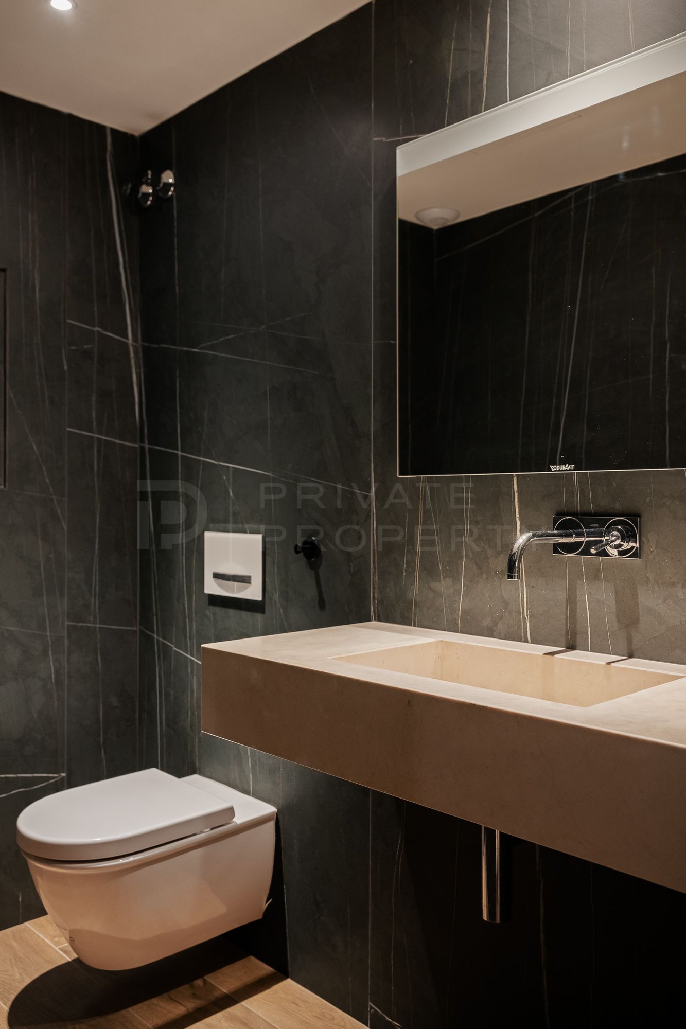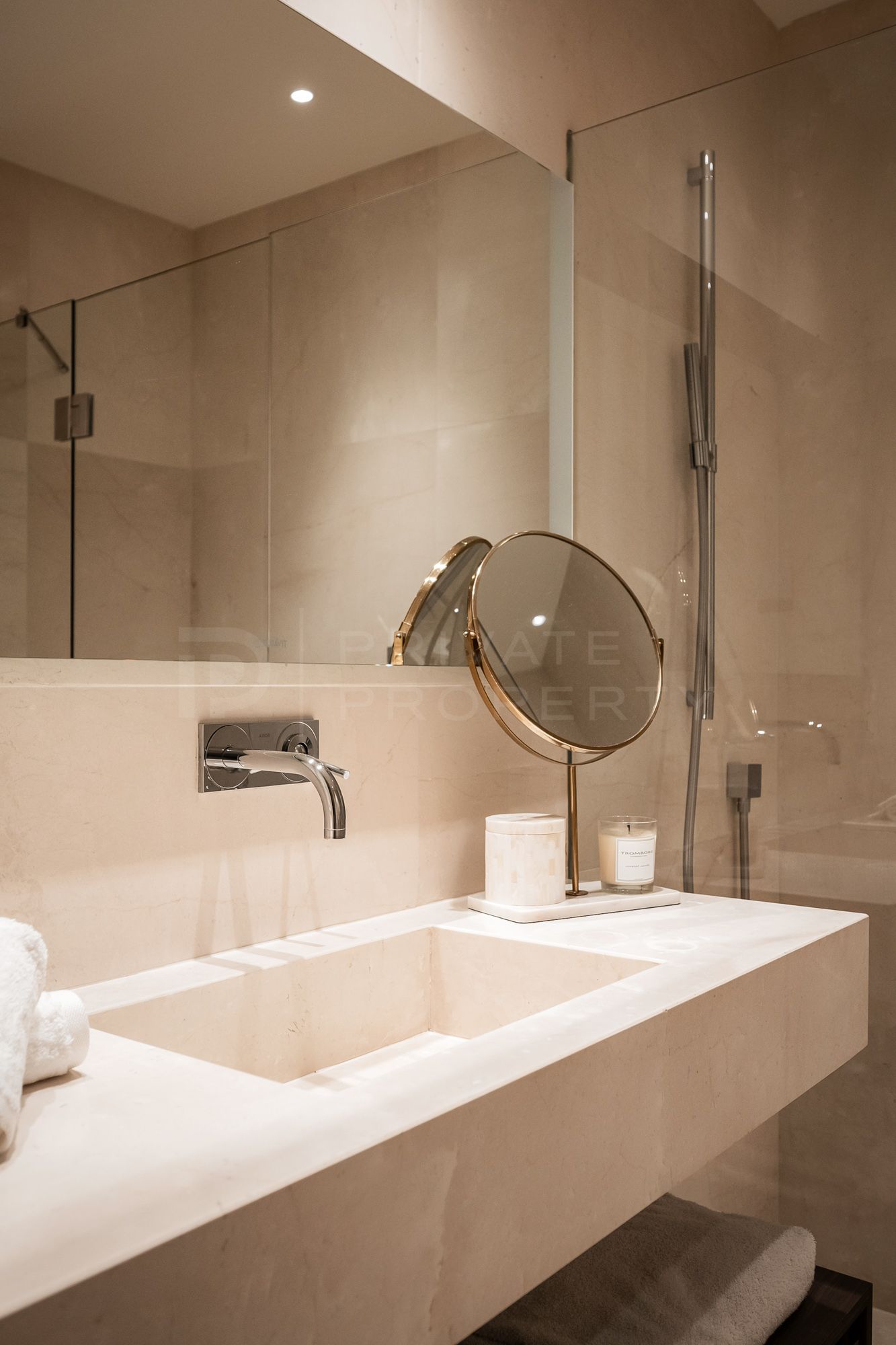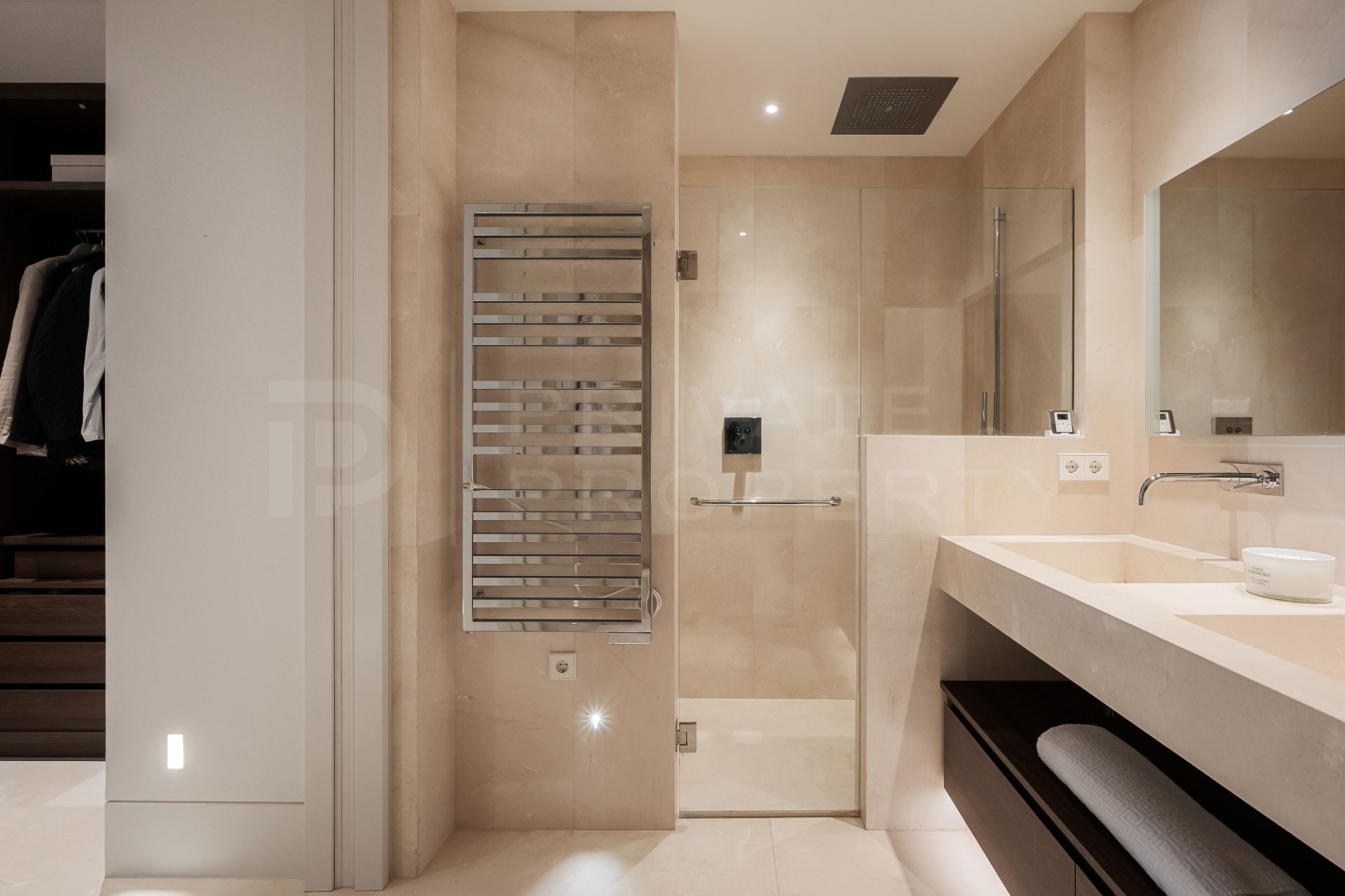 The apartment offers three generously sized bedrooms, each with its own en-suite bathroom. The master suite is particularly impressive, featuring a walk-in wardrobe and a luxurious bathroom designed for comfort and serenity. High-quality finishes throughout the property include underfloor heating, smart home technology, electric blinds, and a fireplace, ensuring year-round comfort and effortless living.