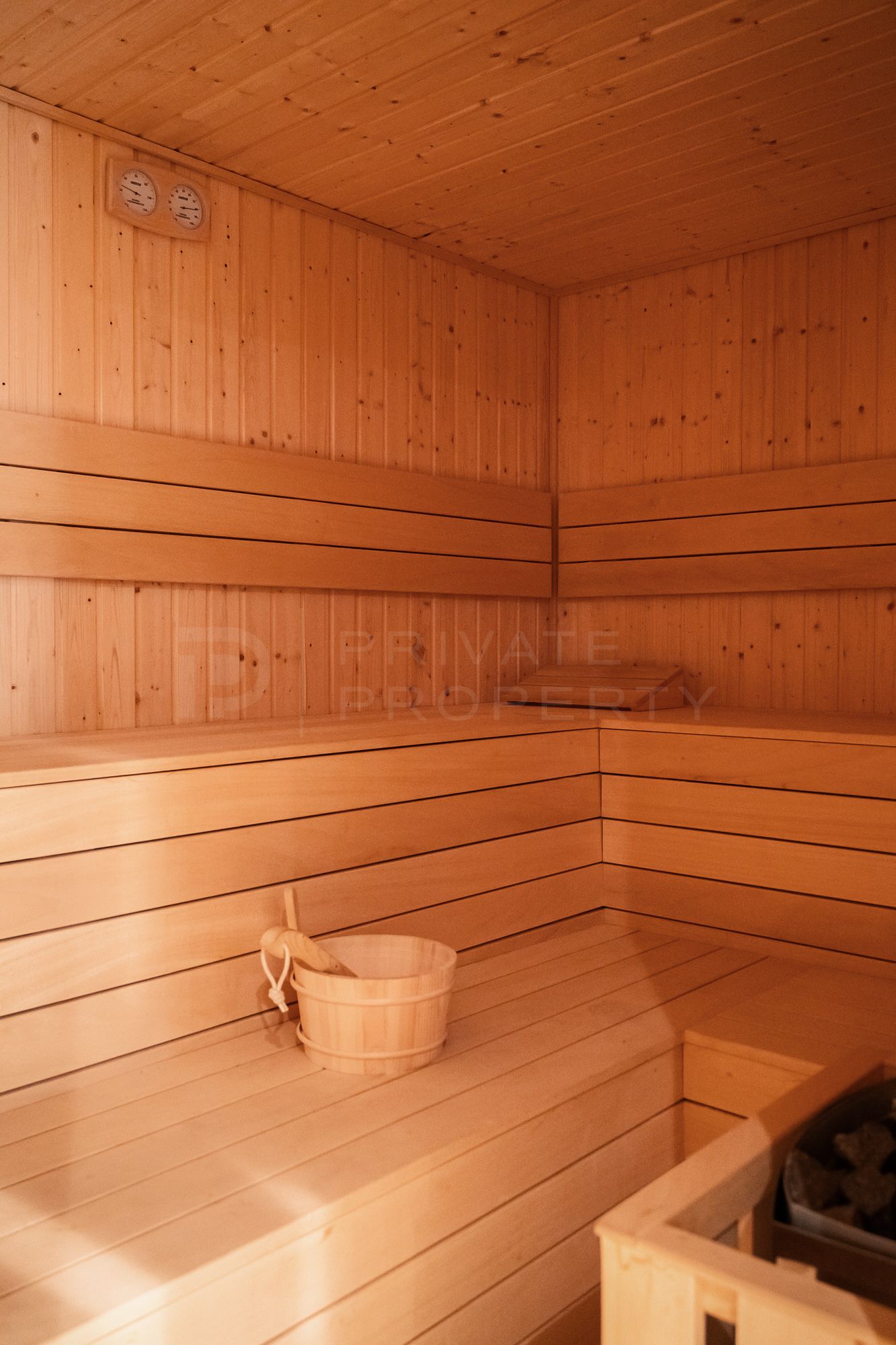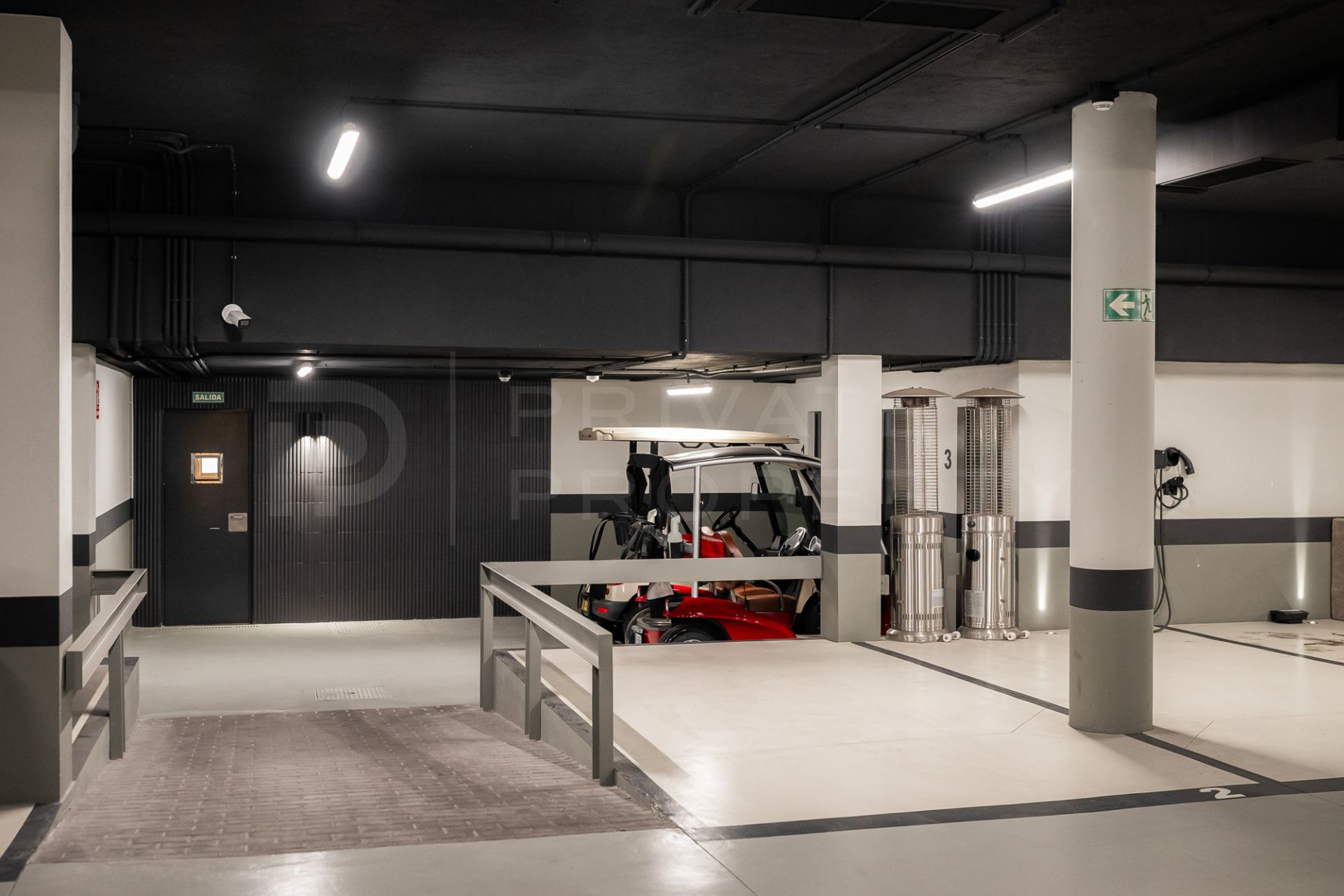 Residents benefit from exclusive access to outstanding communal facilities, including a fully equipped gym, spa, sauna, and steam room, as well as 24-hour security. The property also includes two private garage spaces, a storage room, and a registered electric buggy parking space.