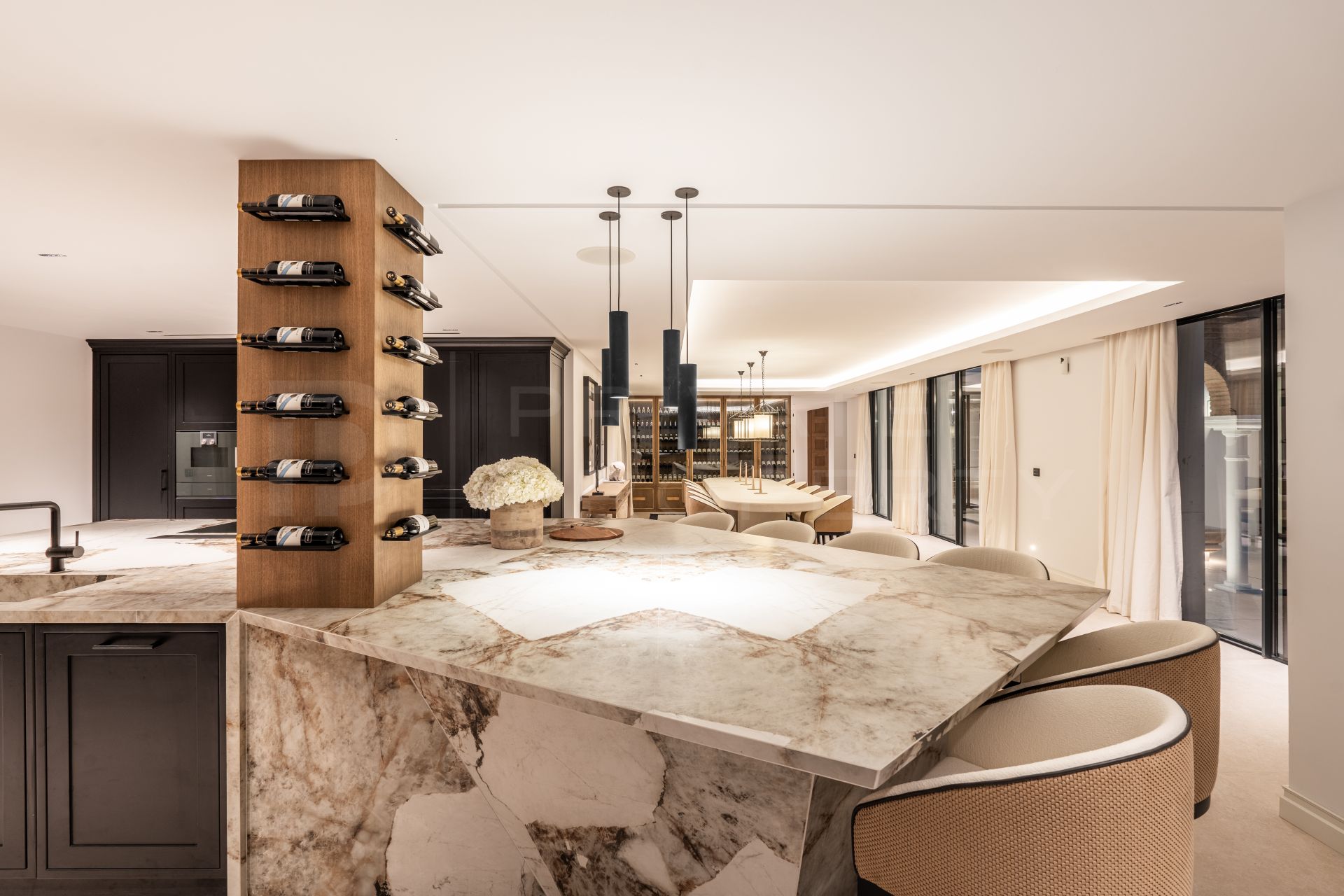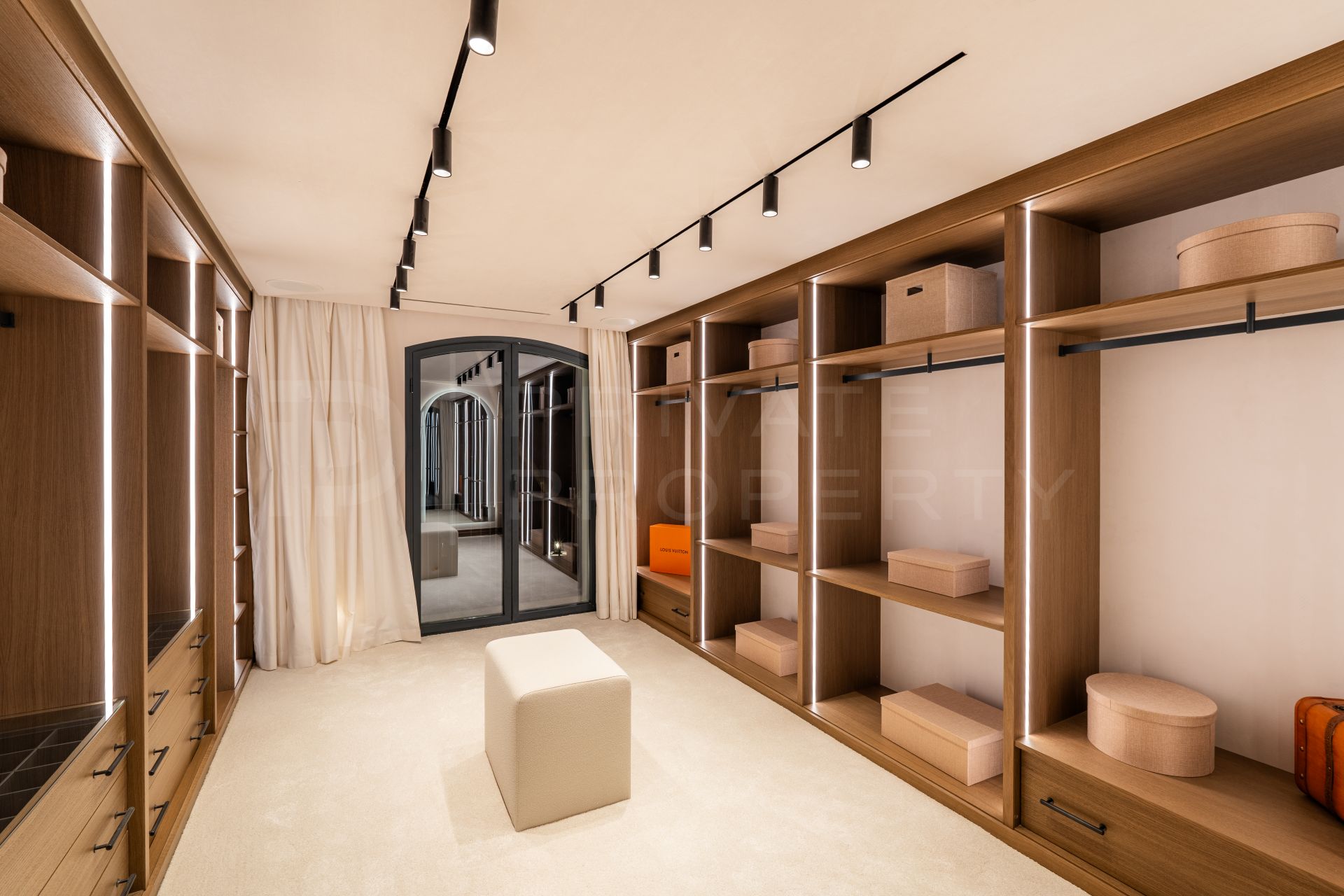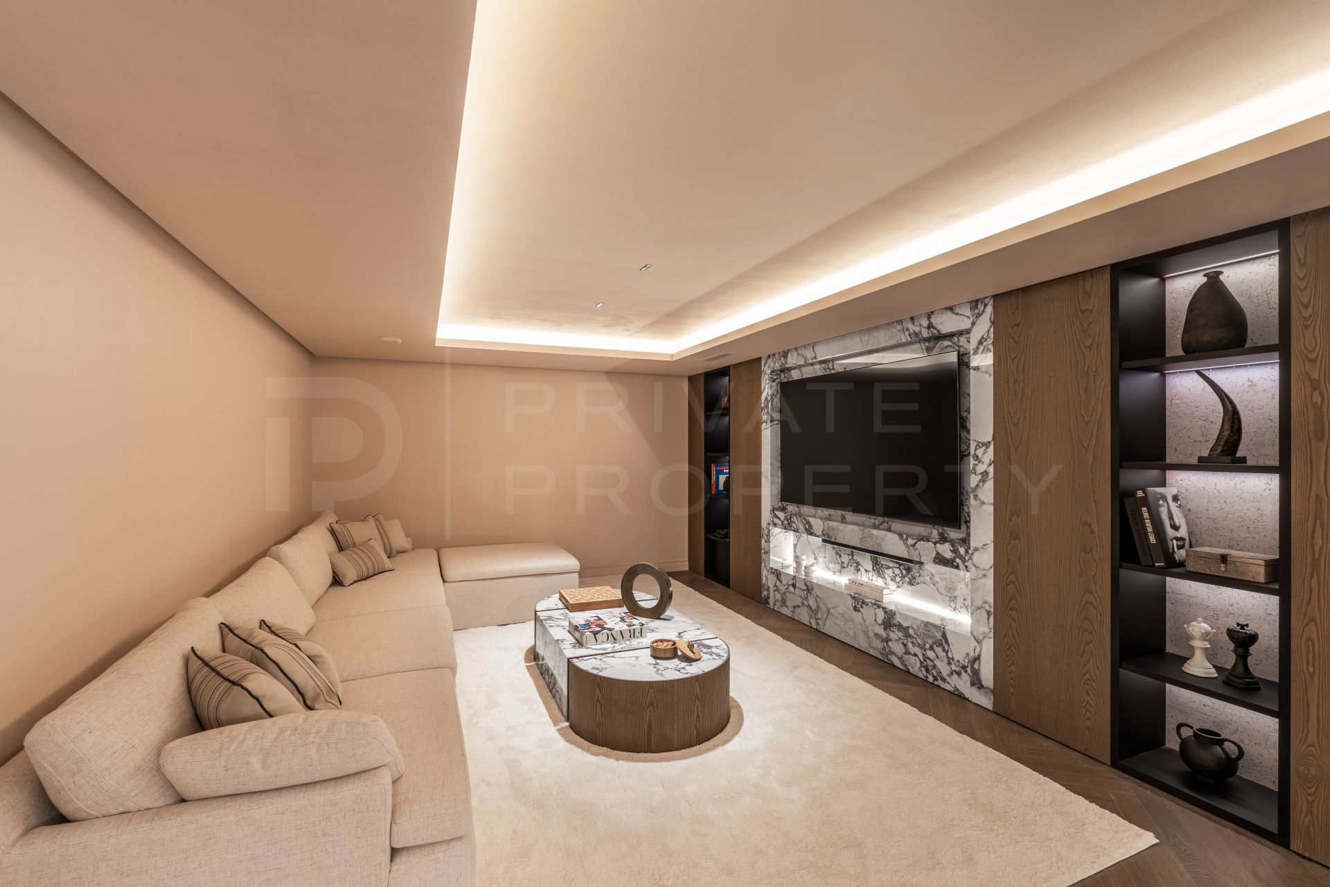 The first floor offers the master bedroom suite with a walk-in dressing room, adjoining en suite bathroom and a generous private terrace, in addition to two guest bedrooms, also benefiting from en suite bathrooms. The lower ground floor boasts plenty of luxury amenities, such as a spa with sauna and steam room, gymnasium, cinema and entertainment room with a bar, as well as additional guest bedroom with en suite bathroom and private garage for several cars with a turntable. Outside are spacious open and covered terraces with a thatched roof, and wonderful private swimming pool, all set amongst the mature private garden.