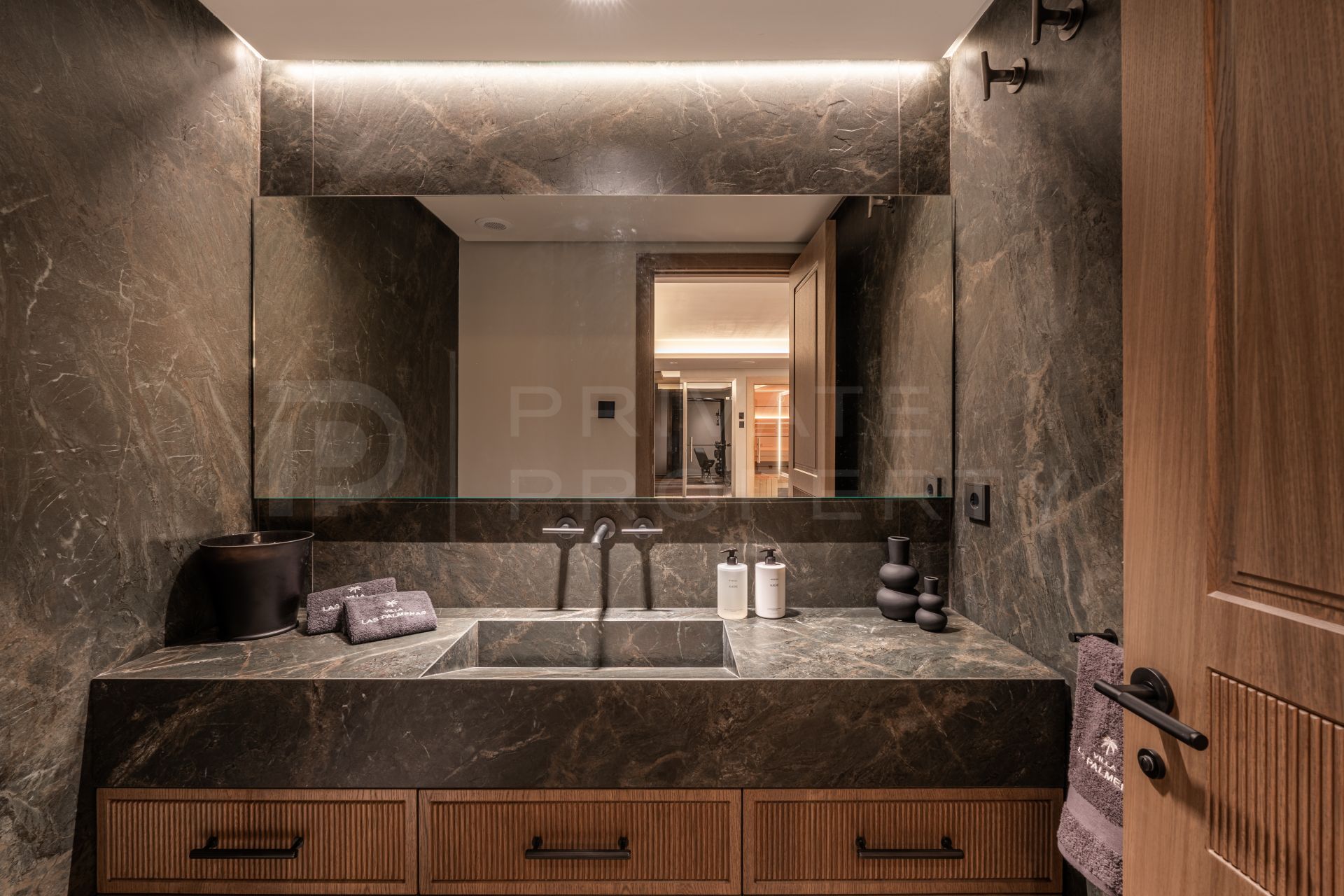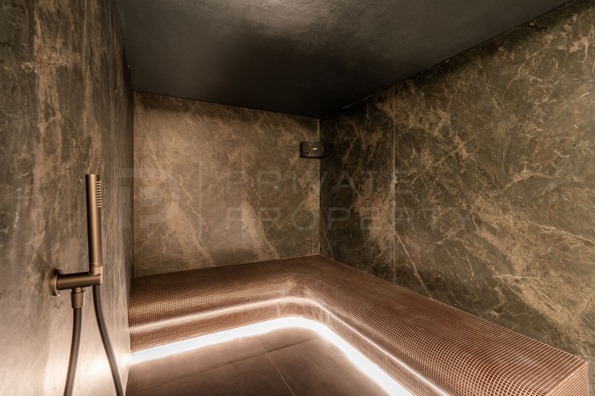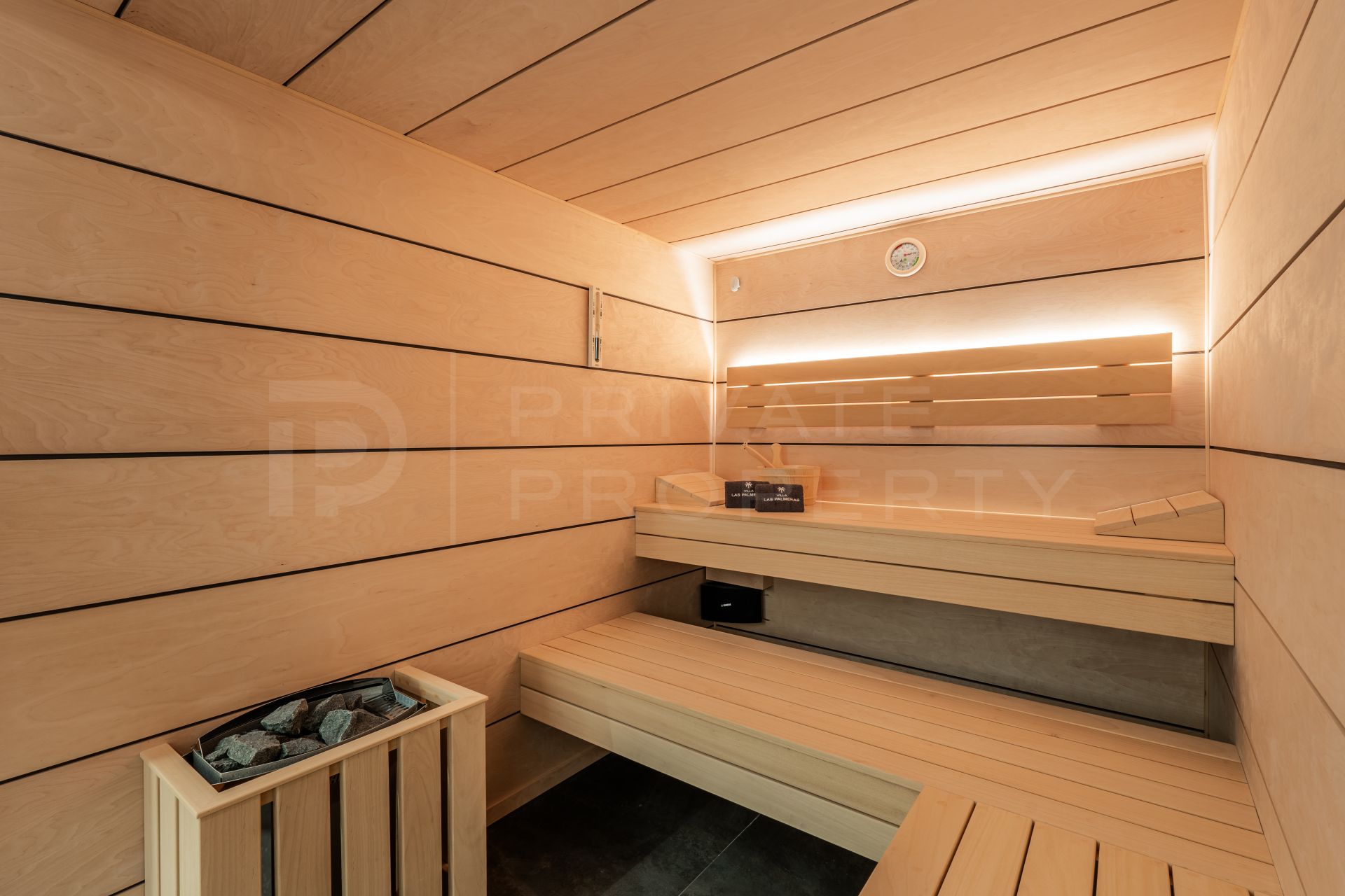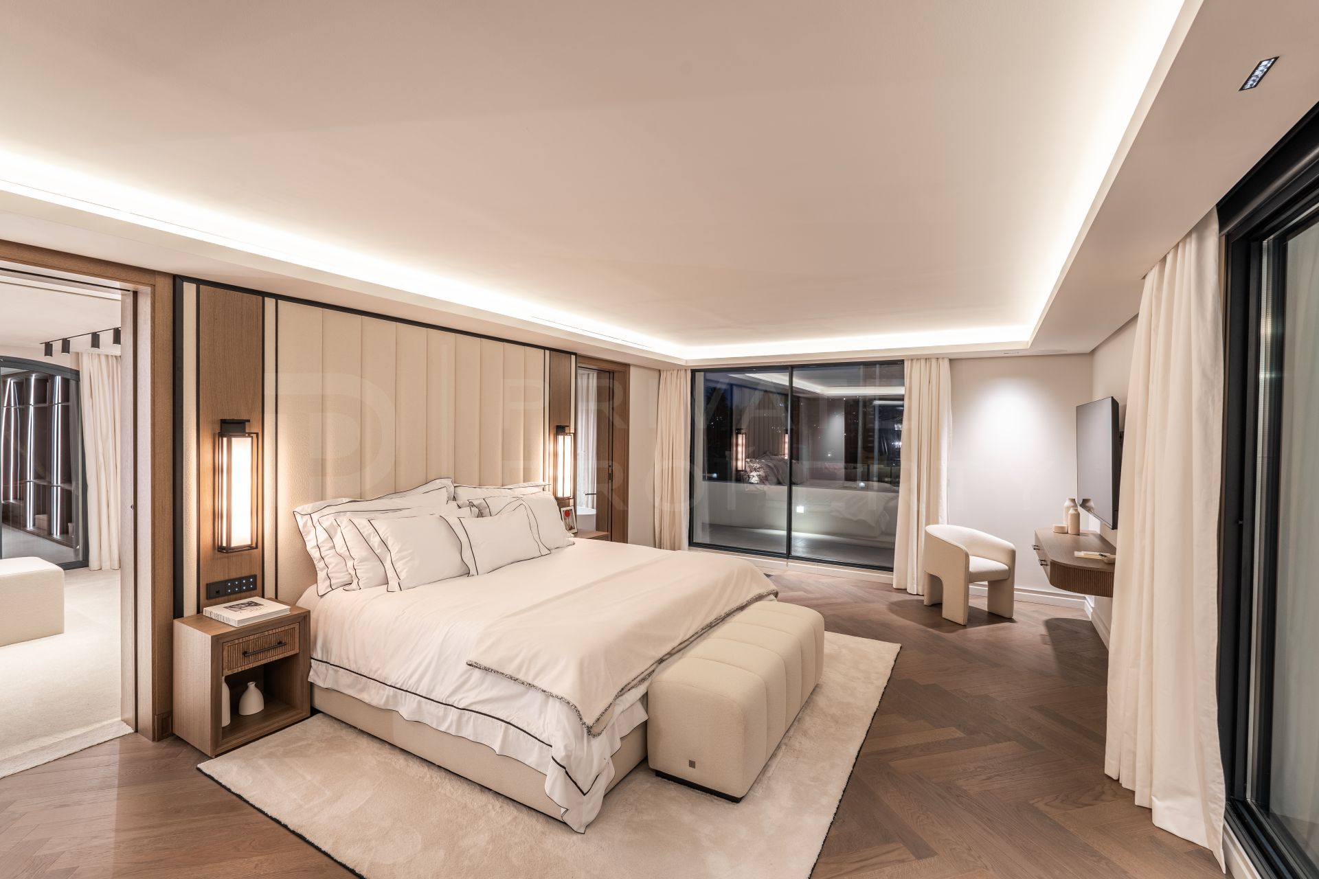 The first floor offers the master bedroom suite with a walk-in dressing room, adjoining en suite bathroom and a generous private terrace, in addition to two guest bedrooms, also benefiting from en suite bathrooms. The lower ground floor boasts plenty of luxury amenities, such as a spa with sauna and steam room, gymnasium, cinema and entertainment room with a bar, as well as additional guest bedroom with en suite bathroom and private garage for several cars with a turntable. Outside are spacious open and covered terraces with a thatched roof, and wonderful private swimming pool, all set amongst the mature private garden.