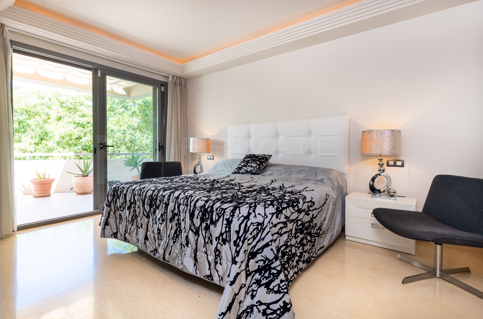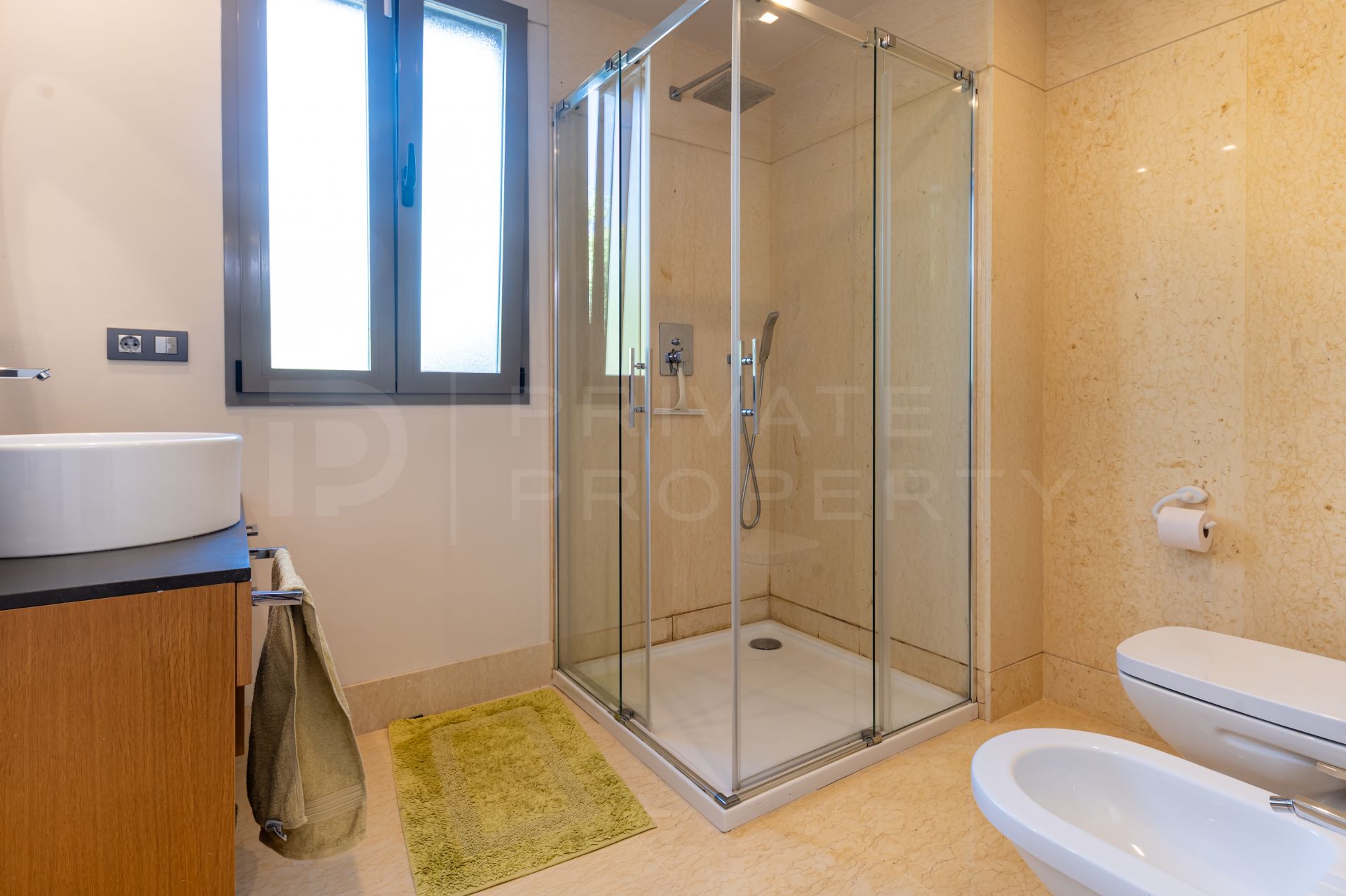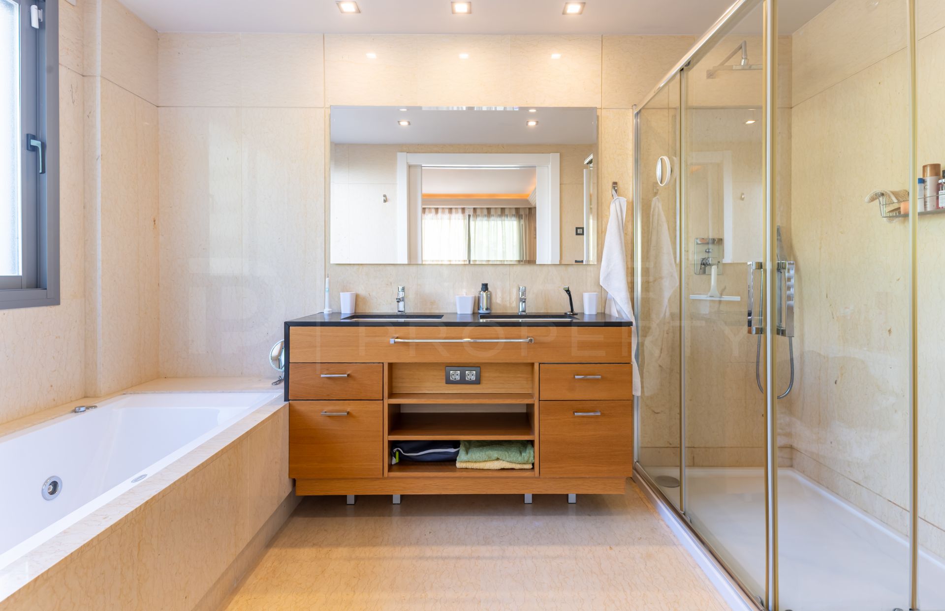 The apartment is finished to a high standard, featuring Egyptian marble flooring throughout, hot and cold air conditioning with independent room controls, and electric shutters that can be operated centrally or individually. Additional features include built-in wardrobes, a safe box, smoke and water sensors and an alarm system. The main bathroom offers a spa-like experience with a separate shower and a bathtub with Jacuzzi. Underfloor heating in the bathrooms and indirect lighting are recommended to further enhance comfort and ambiance.